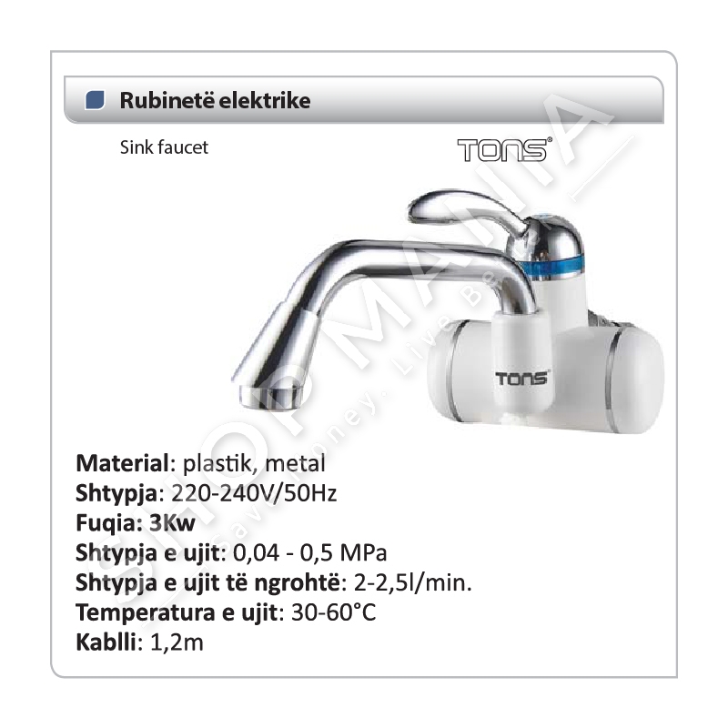 Rubinet elektrik me formen e pershtatur murale qe ngroh deri ne 60°C.Me qafe te shkurter dhe i pajisur me nje kabull qe shkon deri ne 1.2m.