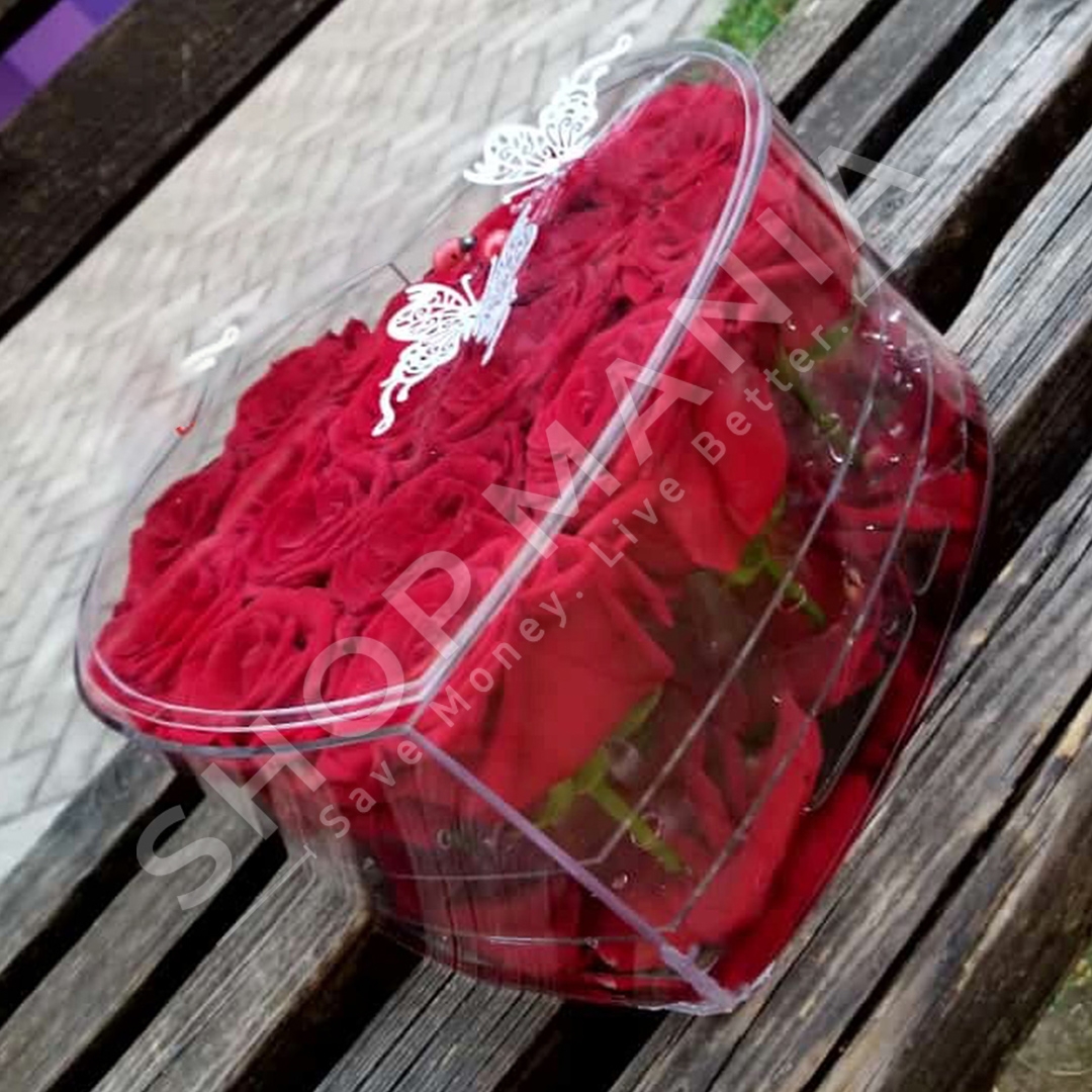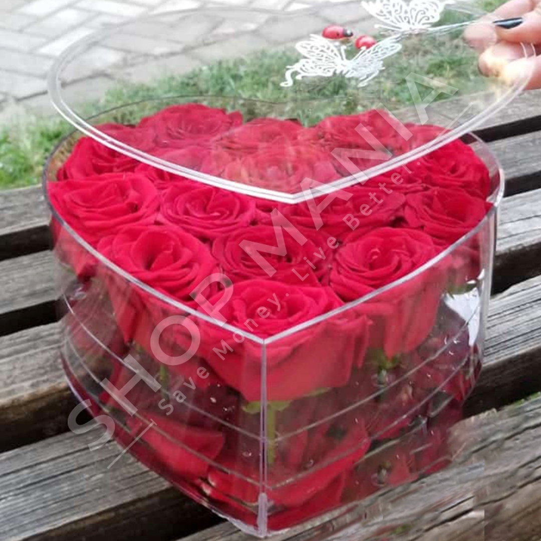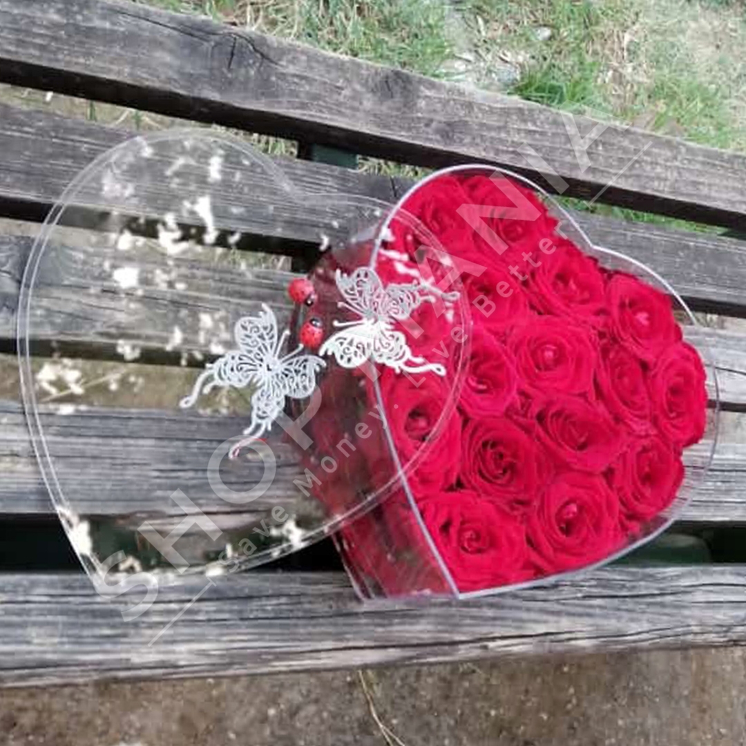 Kutia e qelqit ka formen e zemres dhe mban shume trendafila te kuq.