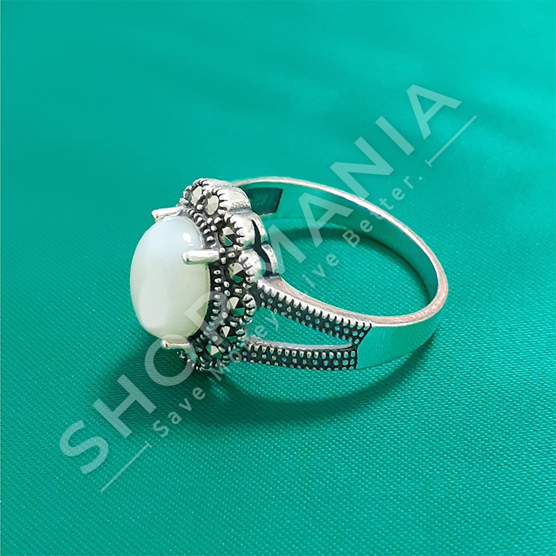 Unaze argjendi me gur zirkoni ne forme rrethore dhe detaje te nderthurura ne forme lule.