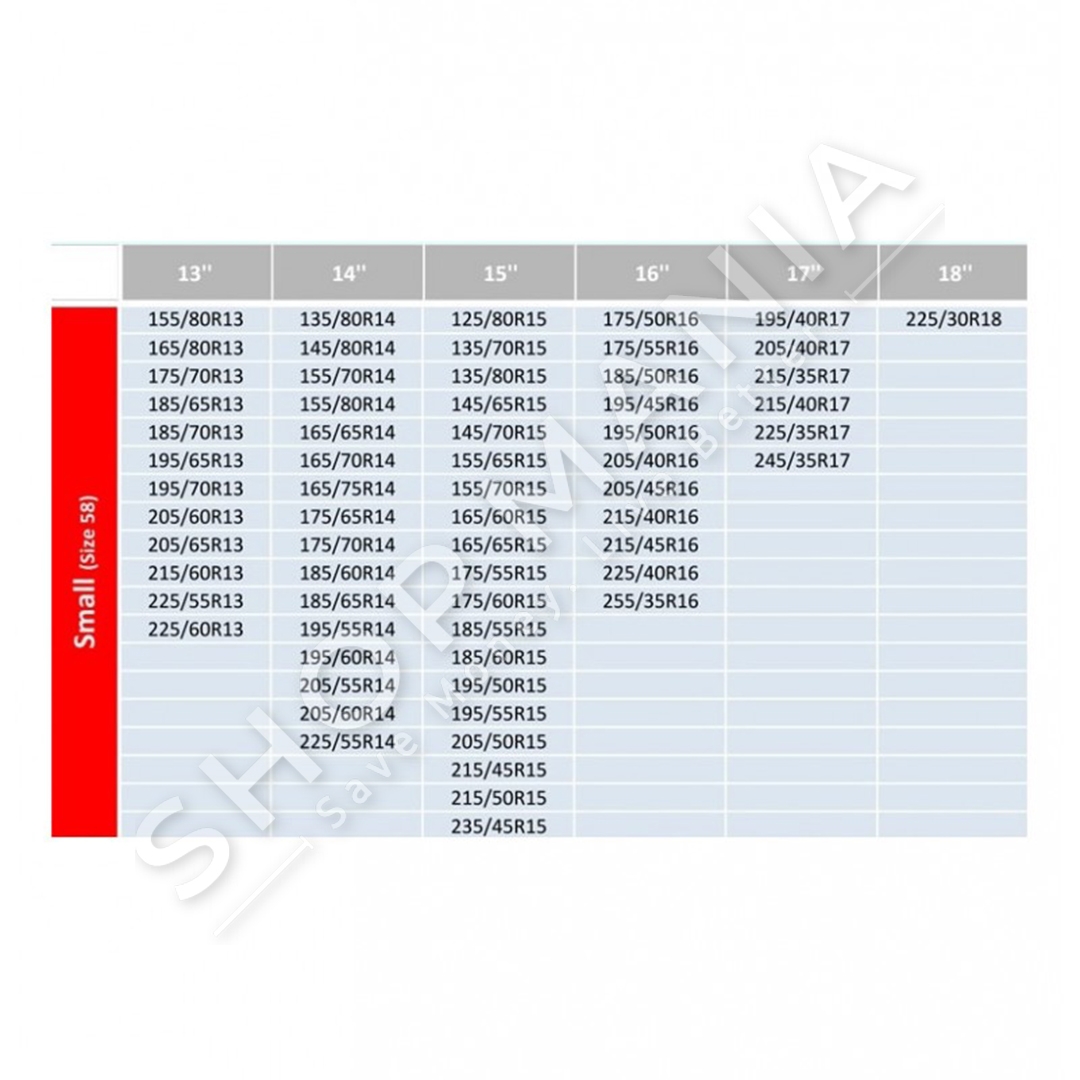 Veshje gomash per bore dhe akull ideale per automjetet. E lehte dhe e shpejte per t'u montuar dhe per t'u hequr edhe ne mot te ftohte dhe te veshtire. Kur nuk perdoret, ky produkt i lehte dhe kompakt eshte lehtesisht i ruajtshem ne bagazh gjate vitit per te qene te pergatitur per nje situate te papritur emergjente. Eshte e rehatshme, nuk shkakton zhurme dhe as dridhje. E pershtatshme per te gjitha automjetet me hapesire te ulet mes gomave dhe trupit te makines. Mund te perdoret gjate dhe lahet ne lavatrice.