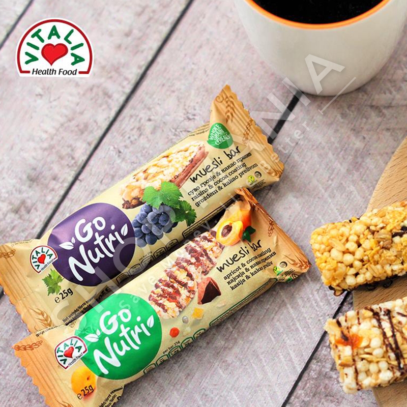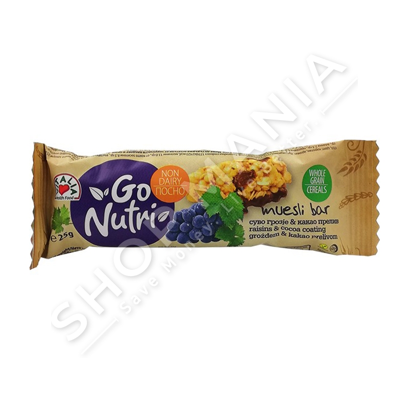 Cokollata Go Nutri bar me rrush te thate dhe kakao ka nje perzierje te shijshme dhe te shendetshme me 3 lloje dritherash si tershera, orizi dhe misri te kombinuara me rrush te thate, te mbuluara pjeserisht me kakao dhe te embelsuara me sheqer kafe.