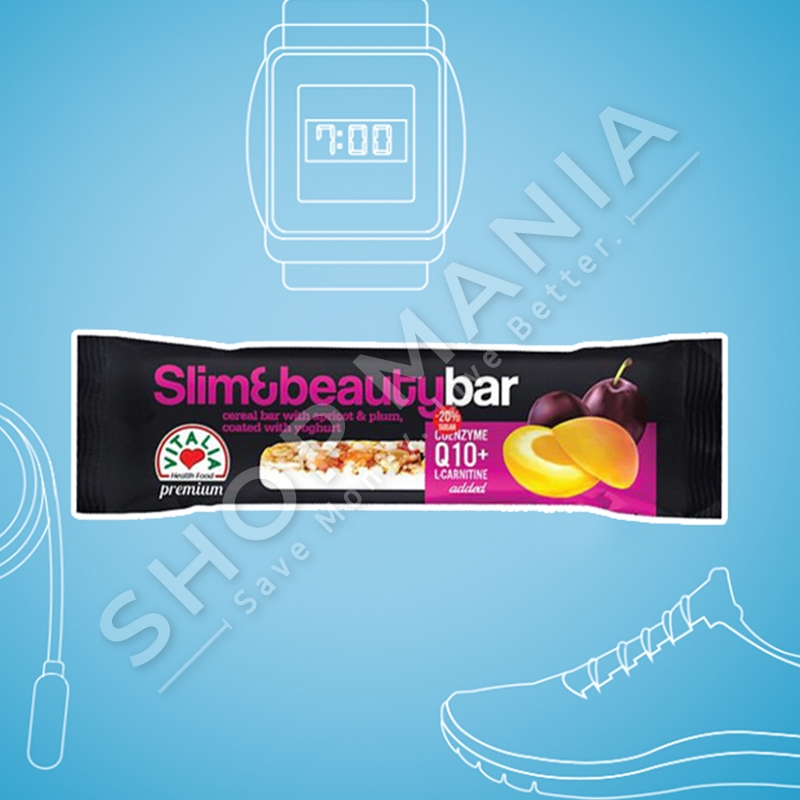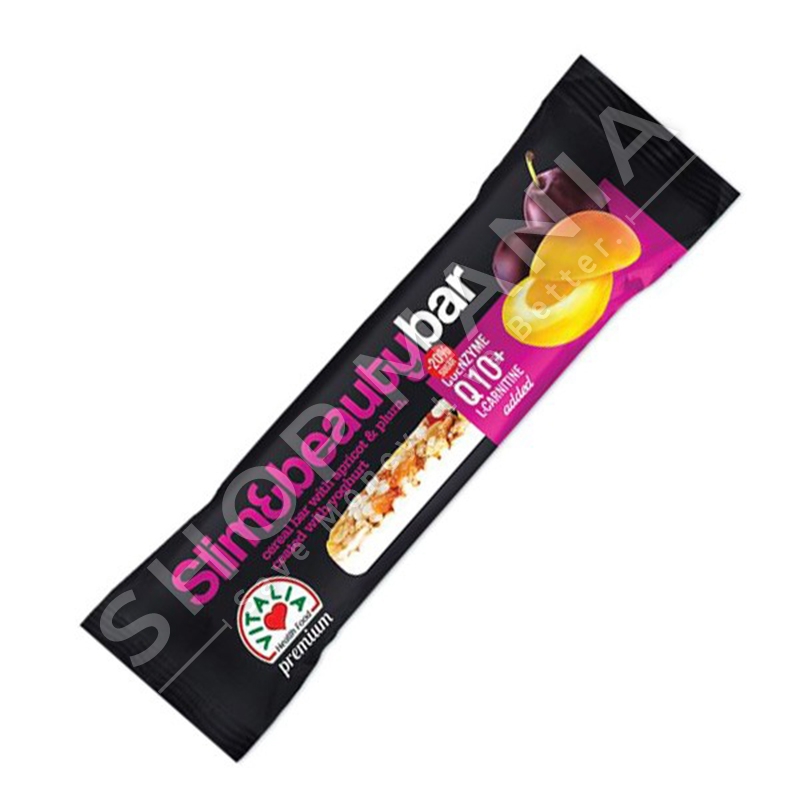 Slim&Beauty bar me kumbull, kajsi dhe shije yogurti.Ka nje shije fantastike dhe permban koenzima Q10+.Mund te konsumohet ne cdo moment te dites.Pesha: 30gr