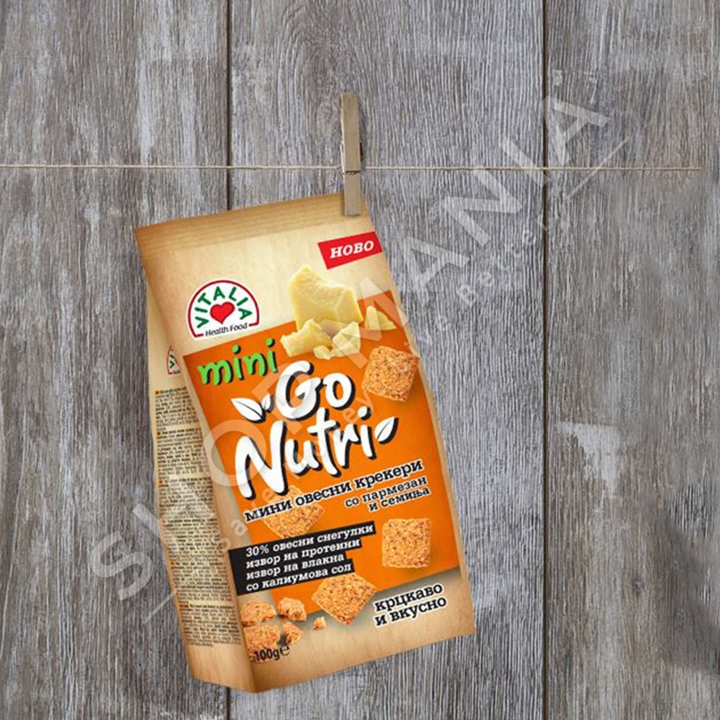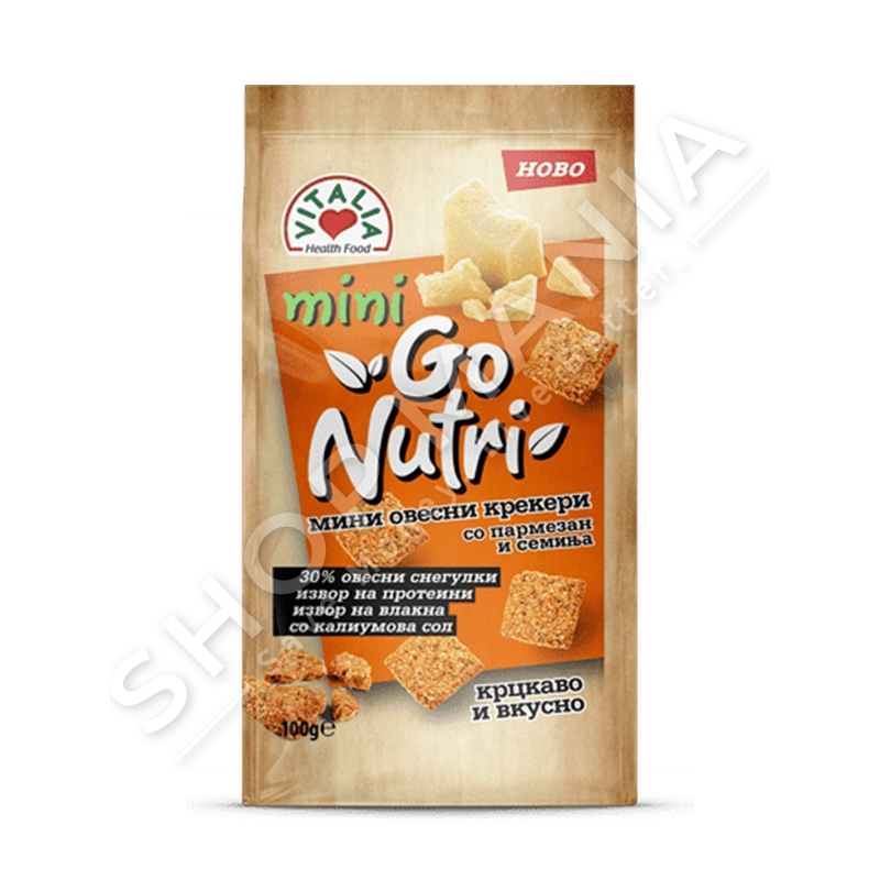 Crackersat e Nutri Go jane nje shkrirje origjinale 30% e thekrave te tersheres te kombinuara me djathin parmesan, faren e lirit, susamin integral dhe orizin e ekstruduar.