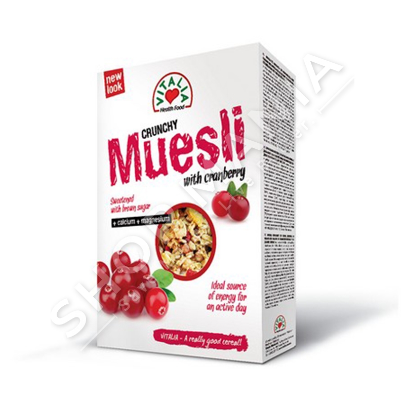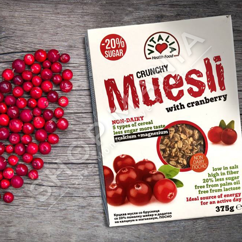 Muesli krokante me boronice te kuqe te perbera nga 5 lloj dritherash, permban sheqer me shume shije, kalcium dhe magnesium.Ka nje permbajtje te ulet kripe dhe perqindje te larte fibrash.Nuk permban vaj palme dhe laktoze.Pesha: 375gr