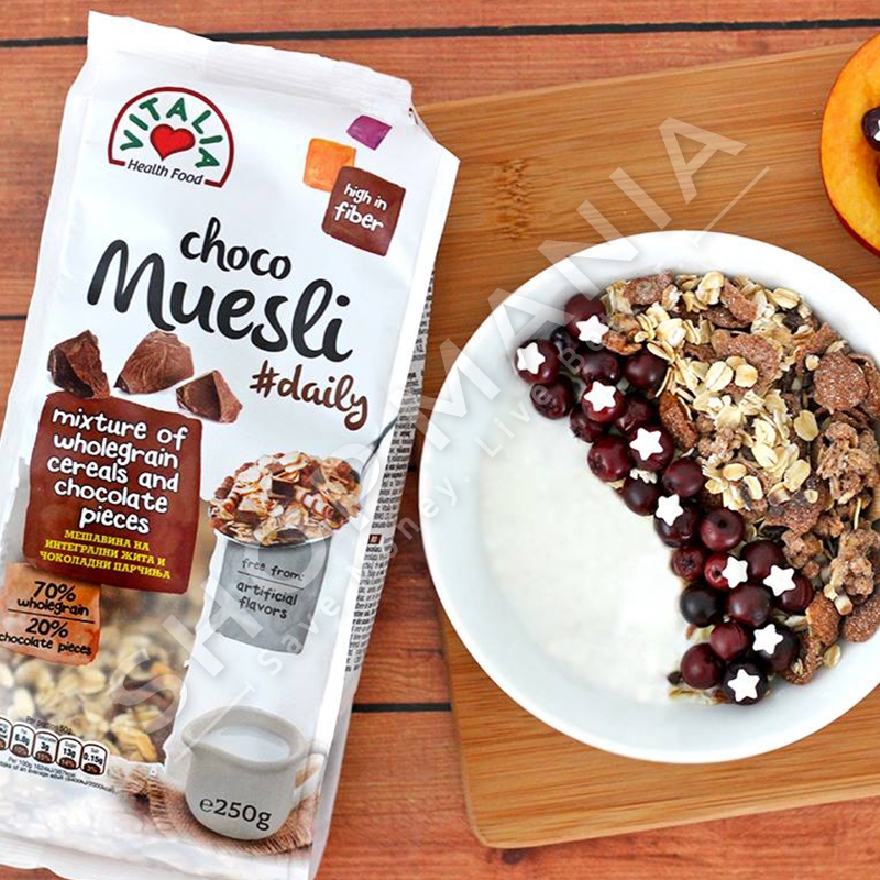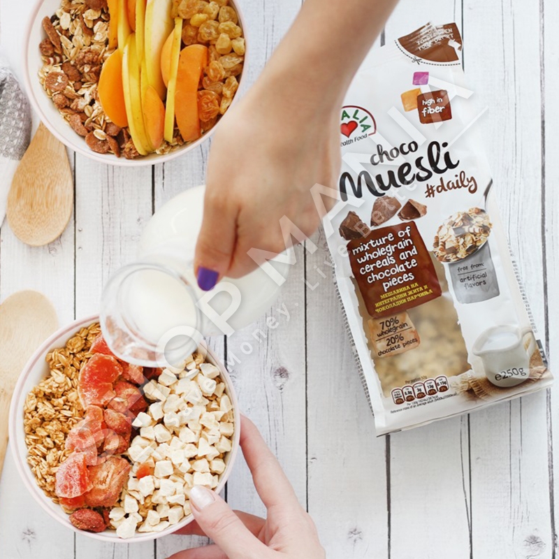 e sojes, arome), oriz kafeje te ekstruduar, muesli te fresket 7% (thekon tershere,