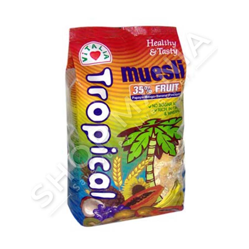 Muesli tropikal sjell frytet e natyres se bashku, permban drithera si tershere, grure dhe thekra, 35% fruta ekzotike tropikale si ananas, papaja, mango, hurme, banane, arre kokosi, rrush te thate dhe 5% fara liri dhe luledielli.