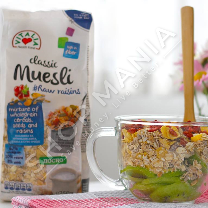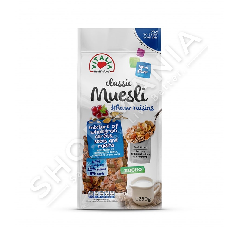 Muesli krokante Vitalia me rrush te thate dhe fara eshte nje ushqim i shendetshem, me cilesi te larte i prodhuar ne nje recete origjinale.