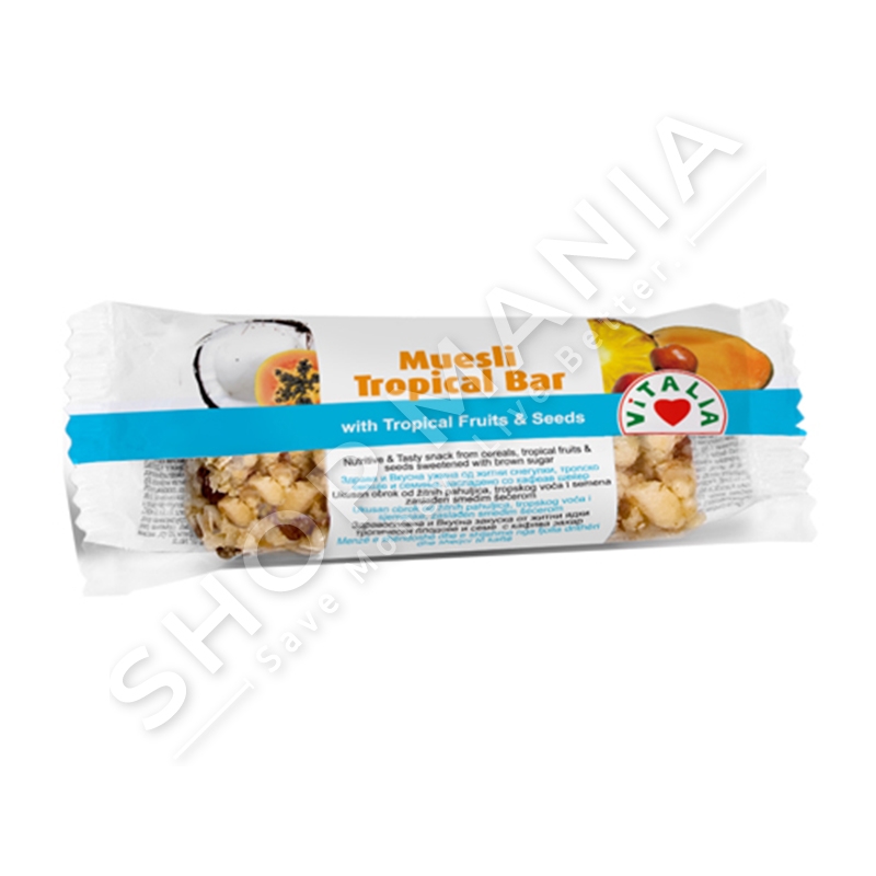 Cokollate muesli me drithera dhe fruta tropikale te embelsuara me sheqer kafe nga marka Vitalia. Eshte nje cokollate shume e shijshme dhe e shendetshme. Mund te konsumohet nga te gjitha grupmoshat ne cdo moment te dites.